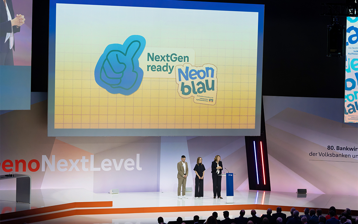 80. Bankwirtschaftliche Tagung, Juli 2025 in Berlin: Die Zukunft der genossenschaftlichen FinanzGruppe ist Neonblau. Mitglieder des jungen, frischen Thinktanks für das Banking von morgen präsentierten ihre Impulse, frische Ideen und gestartete Projekte.